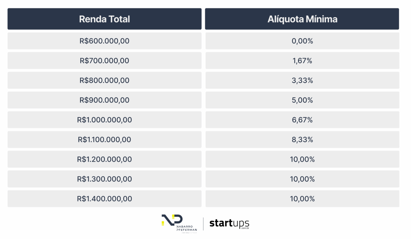 É importante esclarecer que esse regime não consiste em aplicação de uma alíquota fixa de 10% sobre dividendos. A regra cria uma alíquota mínima progressiva que varia de 0% a 10% conforme resumido na tabela abaixo:
