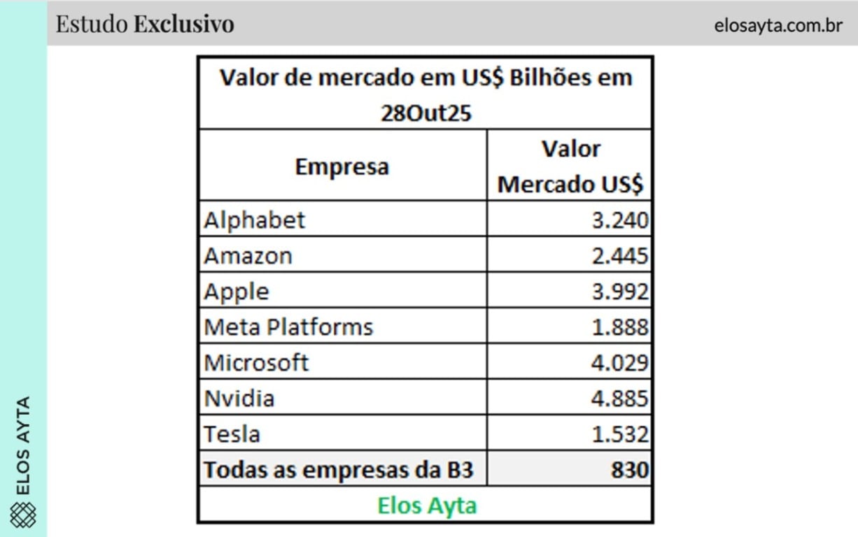 A Tesla é a companhia com o menor valor de mercado no grupo, com US$ 1,5 trilhão, após o pregão desta terça-feira. No ano, a companhia acumula alta de 21%. A fabricante de carros elétricos de Elon Musk apresentou um balanço financeiro fraco no último trimestre, com lucro abaixo do esperado, mas vendas recordes, impulsionadas por clientes que correram para aproveitar o crédito fiscal de US$ 7.500 para compras de veículos elétricos, que expirou em 30 de setembro.
